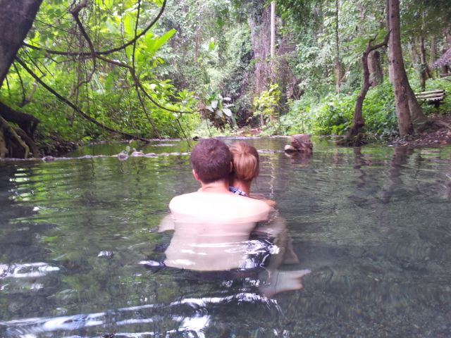 Man glaubt es kaum, aber es gibt noch eine Steigerung zur Hippi-Insel Koh Tao – Pai! Im Vergleich dazu hatte es einiges weniger Touristen, dafür waren die Local umso verchillter, der Opium-Handel in dieser Gegend florierte bis vor wenigen Jahren – überraschungüberraschung. Mal wieder Lust auf ein Jungle-Trekking haben wir eine „kleinere“ Tour gebucht, so àla „ein bisschen durch die Reisfelder spatzotelln, alles gerade und gemütlich…. Najaaaaaaaaaaaaaaaaa, defakto sind wir zusammen mit einem israelischen Päärli und einer Machete quer durch den Jungle gestolpert – so etwa 5 Stunden lang 🙂 Wir sind den „alten“ Pfad eines Jungle-Stammes nach gewandert. Tja, seit die lieben Leutli eine Zufahrtsstrasse ins Dorf haben, versuchen nur noch Deppen-Touris über und unter den Stämmen durch den Dschungel zu kraxeln 🙂 Ein entspanntes Bad in der heissen Quelle mitten im Dschungel war also sehr verdient.