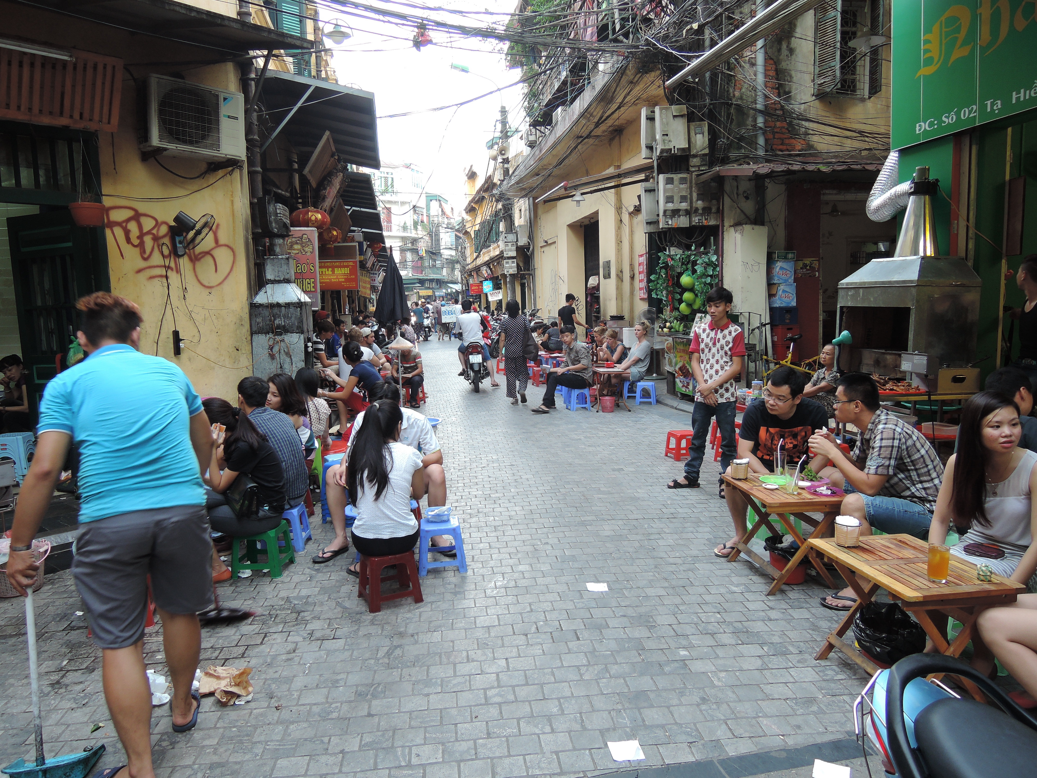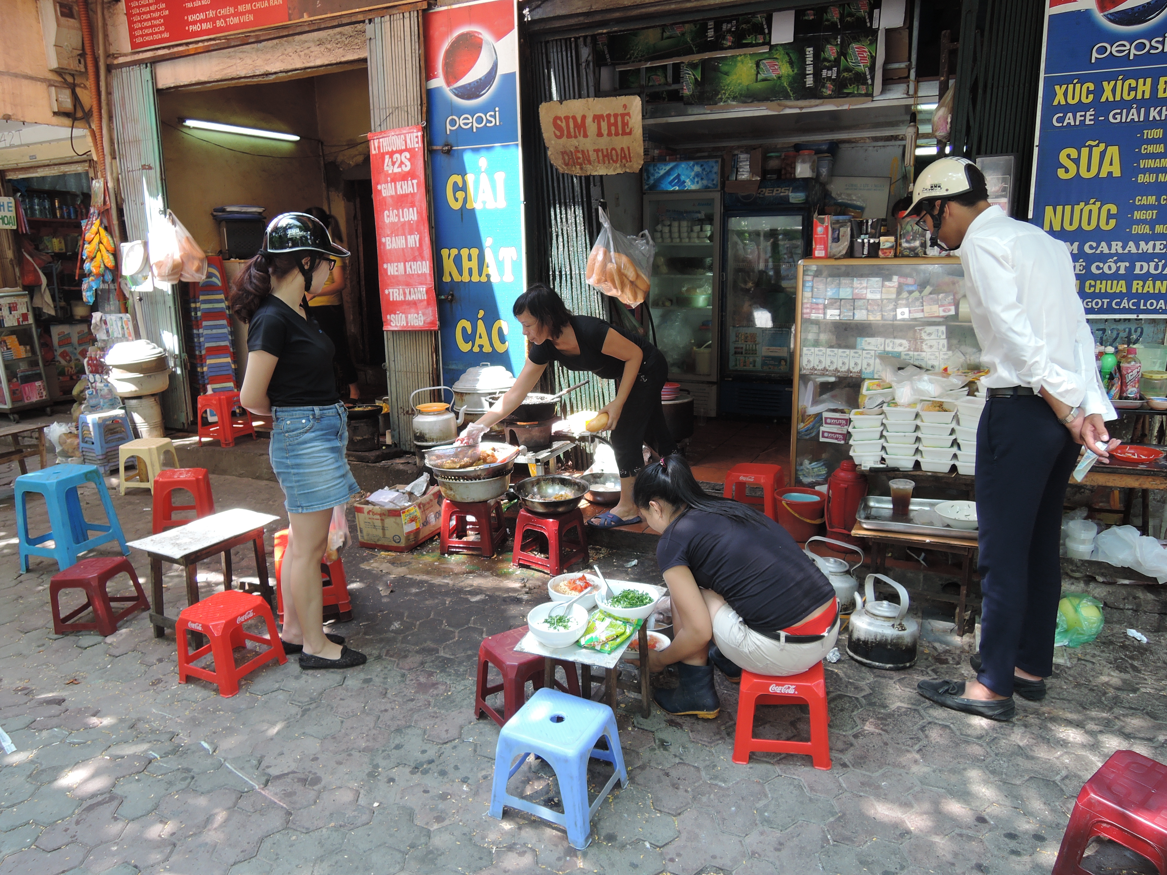 Wer übrigens denkt, Bangkok sei wuselig und habe viel Verkehr, war noch nie in Hanoi! First lesson learned, als ich beim ersten Schritt aus dem Flughafen beinahe von einem Töffli mit 18 Kartons gestappelter Eier überfahren werde, wir alle 10 Meter von quirlligen Marktfraueli etwas angedreht bekommen und über die hunderten „Kinderzimmer-Stühli“ stolpern, auf der die minder grossgewachsenen Erwachsenen ihr selbstgebrautes Bier für umgerechnet 10 Rappen schlürfen. Wir sagen nur: We love it – sofern wir nicht über den Haufen gekarrt werden…:)