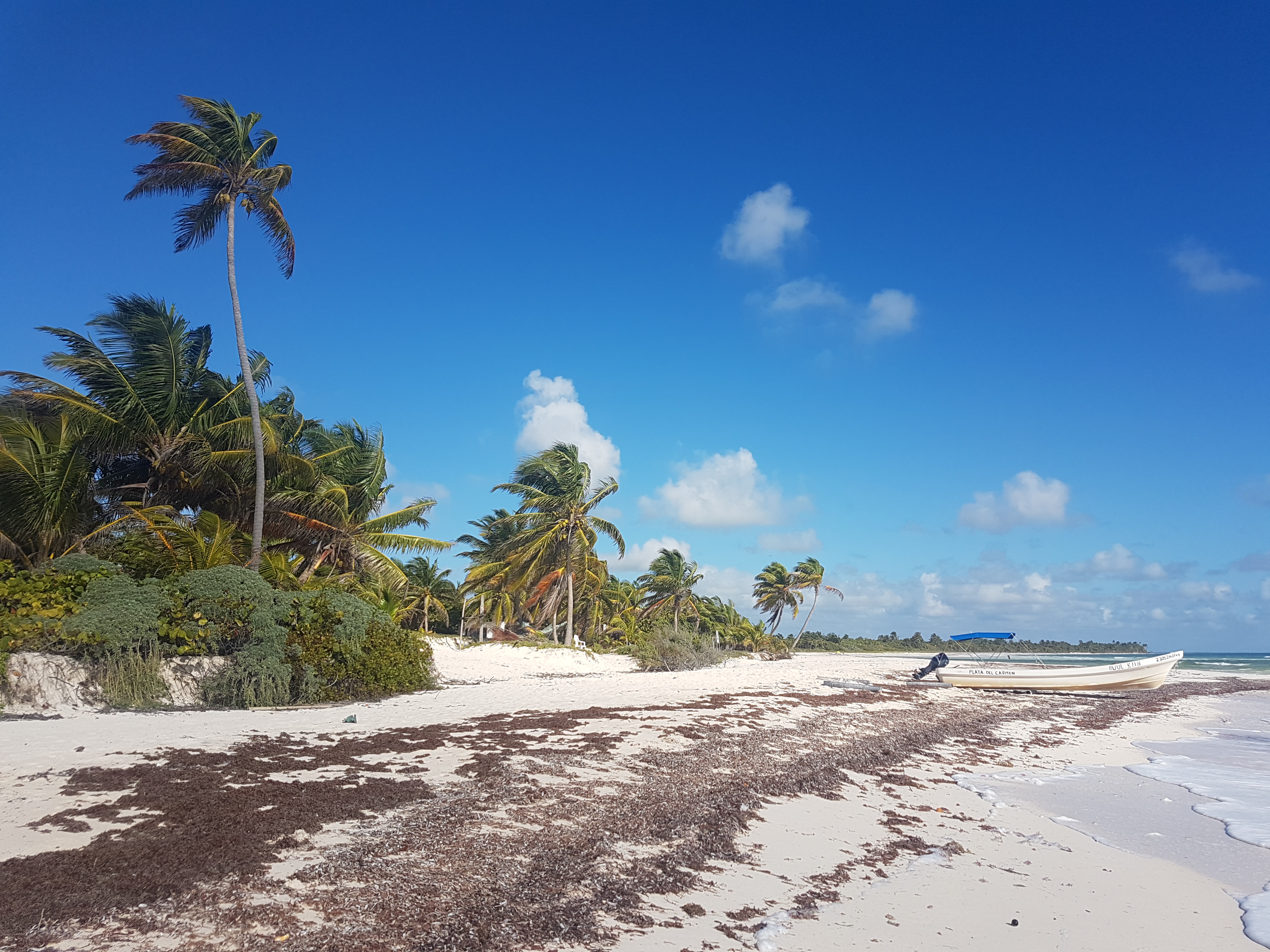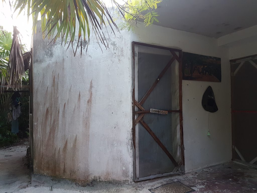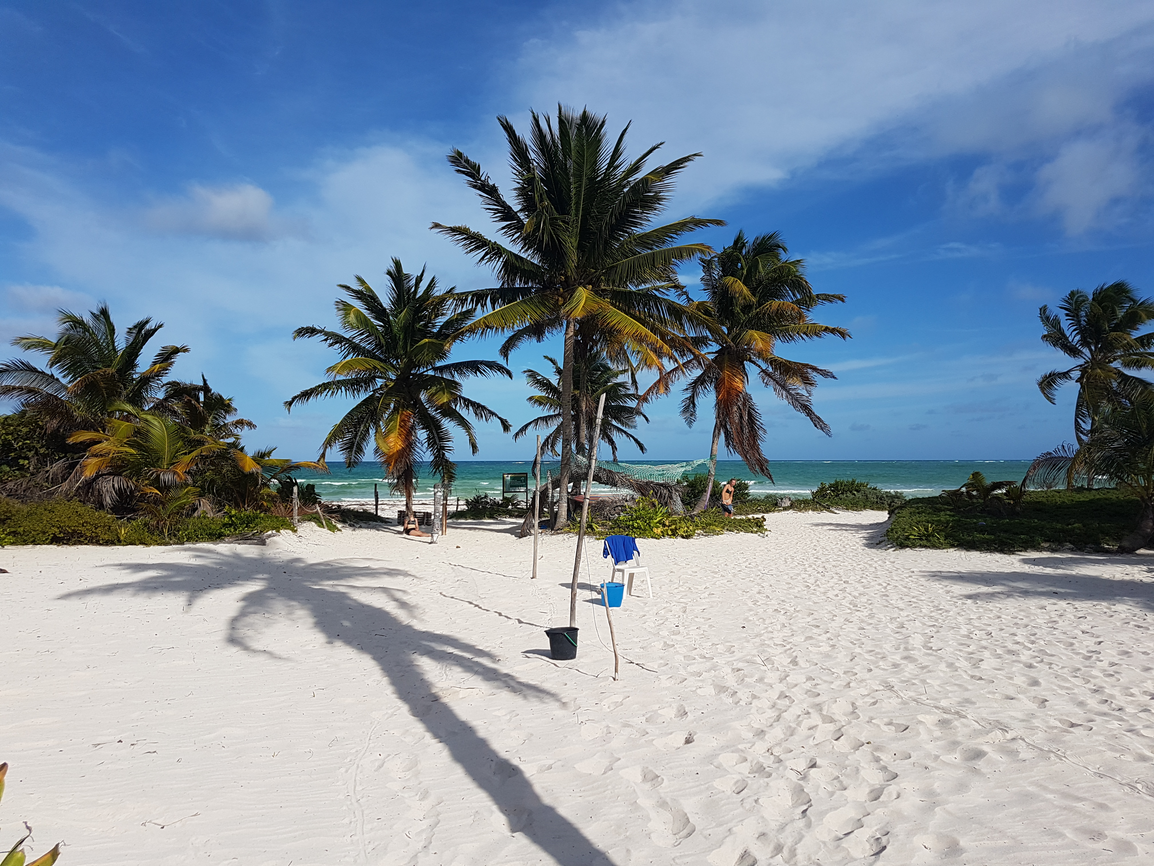 Mein kleines Jungle-Camp befand sich ca. 2 Stunden südlich von Tulum in einem Naturreservat (zwar nur 30 Kilometer entfernt, aber die nicht asphaltierte Strandstrasse mit 1000 Schlaglöcher hatte es in sich…). Ich fand eine perfekt aufgeräumte Basis inmitten vom Jungle vor, direkt am Strand mit einer atemberaubenden Aussicht. Küche mit Gasherd, Gemeinschaftszone und eine Menge Lagerräume für all die vielen Dinge, die man so braucht im Jungle (es ist tatsächlich eine logistische Meisterleistung, 30 Personen dort leben und überleben zu lassen..). Via Sand-Pfad durch mitten durch das Grünzeug kam man zu den Unterkünften.